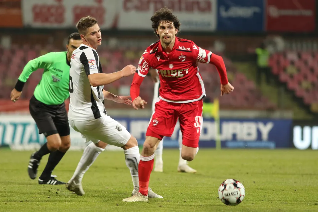 Gabriel Simion (S), de la AFC Astra Giurgiu, lupta pentru balon cu Diego Fabbrini (D), de la Dinamo Bucuresti, in timpul meciului de fotbal din etapa a XXIII-a a Ligii 1, disputat pe stadionul Dinamo din Bucuresti, sambata, 1 februarie 2020. GEORGE FILIP / MEDIAFAX FOTO