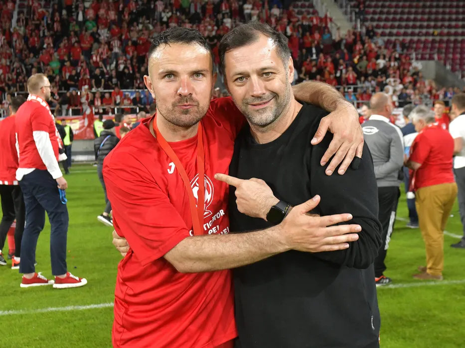 Adnan Aganovic pozeaza alaturi de Marian Olaianos dupa meciul de fotbal dintre Sepsi OSK Sfantu Gheorghe si FC Voluntari, finala Cupei Romaniei, desfasurat pe Stadionul Rapid din Bucuresti, joi 19 mai 2022. © FOTO:Razvan Pasarica/