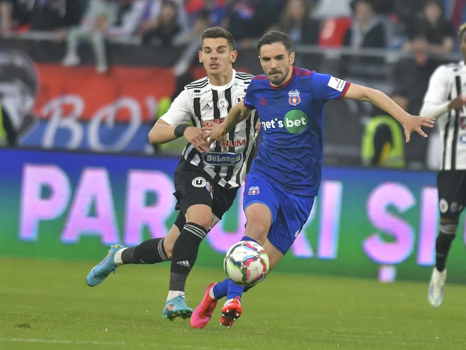 Marius Florian Ciobanu si Dean Beta in meciul de fotbal dintre Steaua Bucuresti si Universitatea Cluj, contand pentru Play-off-ul Ligii a-2-a Casa Pariurilor, desfasurat pe Stadionul Steaua-Ghencea din Bucuresti, miercuri 4 mai 2022. © FOTO:Razvan Pasarica/SPORT PICTURES