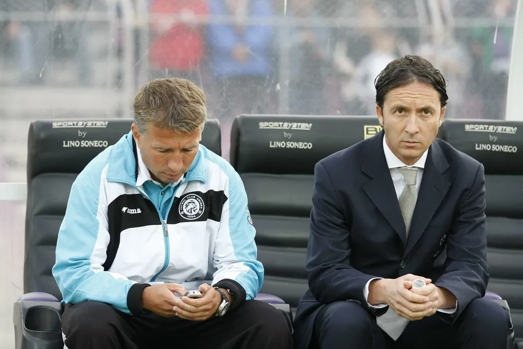 Antrenorul echipei Unirea Urziceni, Dan Petrescu si Mihai Stoica, manager general, urmaresc meciul cu FC Timisoara, din cadrul etapei a XXXIII-a a Ligii I, in Timisoara, duminica, 31 mai 2009. Formatia Unirea Urziceni a invins, cu scorul de 2-1 (0-1), echipa FC Timisoara si ar putea deveni noua campioana a Romaniei, titlul urmand sa se decida la 5 iunie, cand Tribunalul de Arbitraj Sportiv (TAS) va anunta decizia in cazul palmaresului timisorenilor. COSMIN DAN / MEDIAFAX FOTO