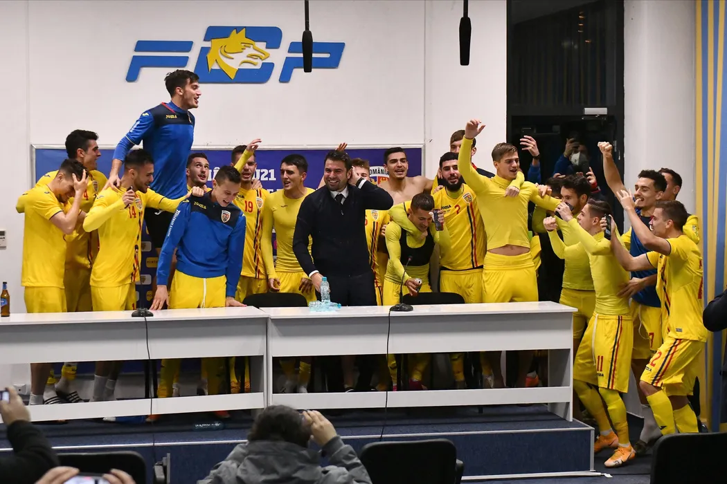 Fotbalistii romani se bucura alaturi de antrenorul lor, Adrian Mutu, dupa calificarea la Campionatul European din 2021 la conferinta de presa in urma meciului de fotbal dintre Romania U21 si Danemarca U21, desfasurat fara spectatori pe Stadionul Ilie Oana din Ploiesti, marti 17 noiembrie 2020. © FOTO:Razvan Pasarica/SPORT PICTURES