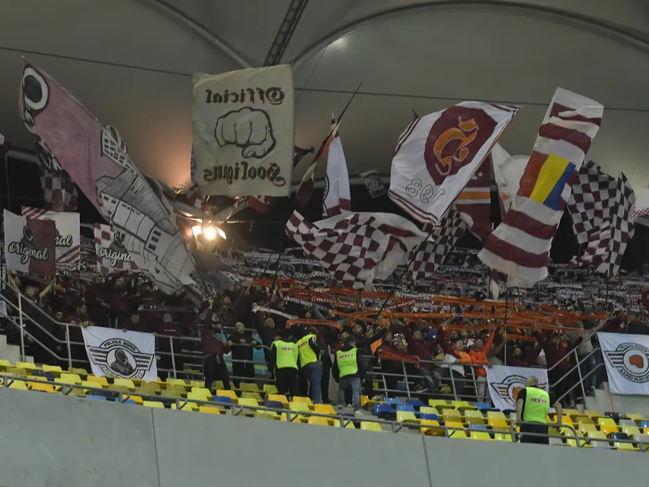 Galeria rapidista cu steaguri si fulare isi incurajeaza favoritii la meciul de fotbal dintre FCSB si Rapid Bucuresti, contand pentru Superliga Superbet, desfasurat pe Arena Nationala din Bucuresti, duminica 6 noiembrie 2022. © FOTO:Razvan Pasarica/SPORT PICTURES