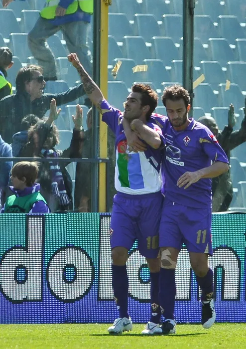 Fiorentina's Romanian forward Adrian Mutu (C) celebrates with his teammate Montolivo after scoring against AS Roma during their Italian Serie A football match on March 20, 2011 at Florence's Artemio Franchi comunal stadium.,Image: 91731478, License: Rights-managed, Restrictions: , Model Release: no, Credit line: Profimedia