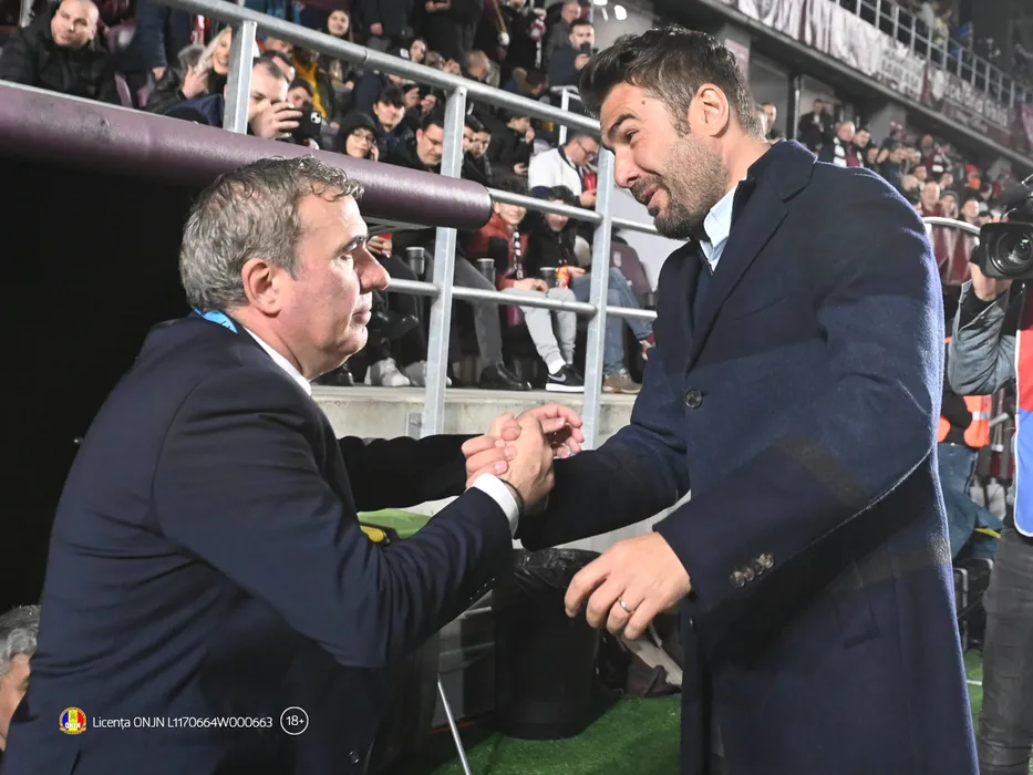 Cei doi antrenori Gheorghe Hagi si Adrian Mutu se saluta inaintea meciului de fotbal dintre Rapid Bucuresti si Farul Constanta, contand pentru Play-off-ul Superligii Superbet, desfasurat pe Stadionul Rapid Giulesti din Bucuresti, sambata 1 aprilie 2023. Bucuresti *** The two coaches Gheorghe Hagi and Adrian Mutu greet each other before the football match between Rapid Bucharest and Farul Constanta, counting for the Superbet Superligi Play off, held at the Rapid Giulesti Stadium in Bucharest, Saturday April 1, 2023 Bucharest Copyright: xRazvanxPasarica/SPORTxPICTURESx