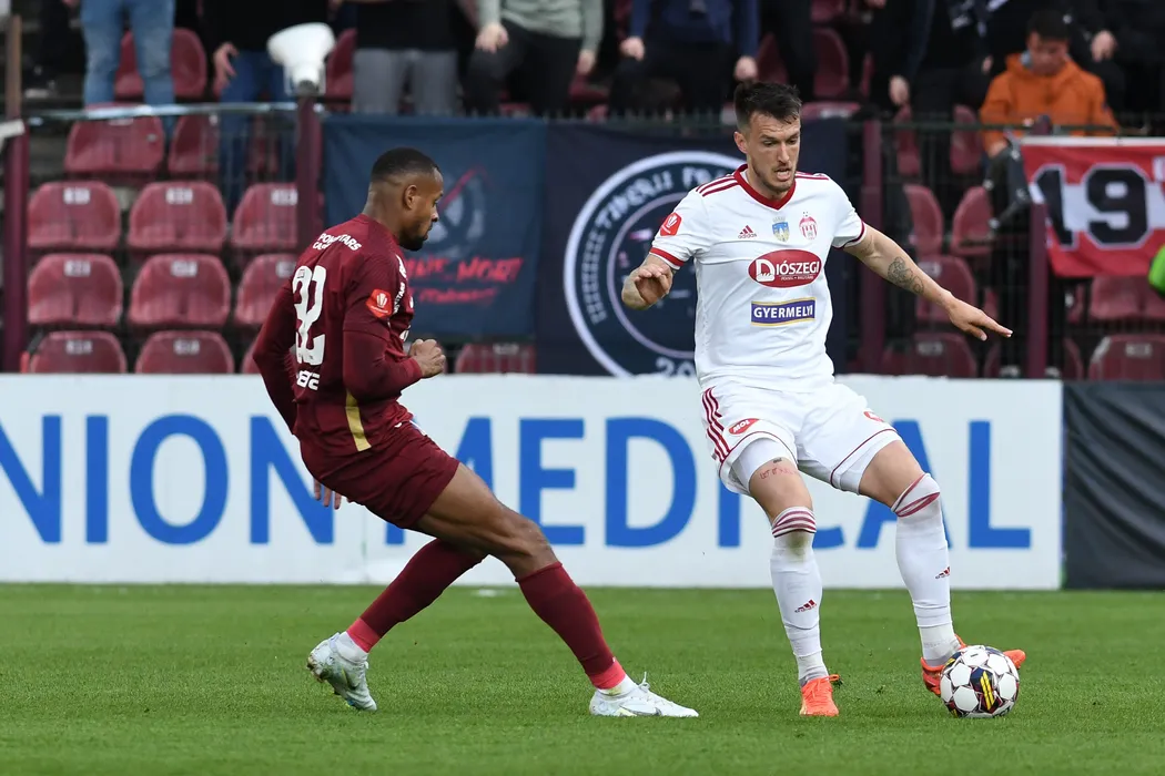 Rangelo Maria Janga si Mark Tamas in meciul de fotbal dintre CFR Cluj si Sepsi OSK Sfantu Gheorghe, contand pentru Play-off-ul Superligii Superbet, desfasurat pe Stadionul Dr. Constantin Radulescu din Cluj Napoca, sambata 15 aprilie 2023. © FOTO:Flaviu Buboi/SPORT PICTURES