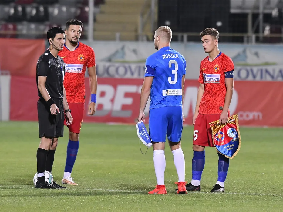 Arbitrul central Aliyar Aghayev alaturi de Adrian Tabarcea Petre si Ovidiu Ioan Perianu in meciul de fotbal dintre FCSB si Slovan Liberec, contand pentru Liga Europa, desfasurat fara spectatori pe Stadionul Marin Anastasovici din Giurgiu, miercuri 24 septembrie 2020. © FOTO:Razvan Pasarica/SPORT PICTURES