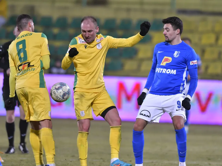Manuel Adrian Scarlatache si Adrian Petre Tabarcea in meciul de fotbal dintre CS Mioveni si Farul Constanta, contand pentru Liga 1 Casa Pariurilor, desfasurat pe Stadionul Orasenesc din Mioveni, miercuri 9 februarie 2022. © FOTO:Razvan Pasarica/SPORT PICTURES