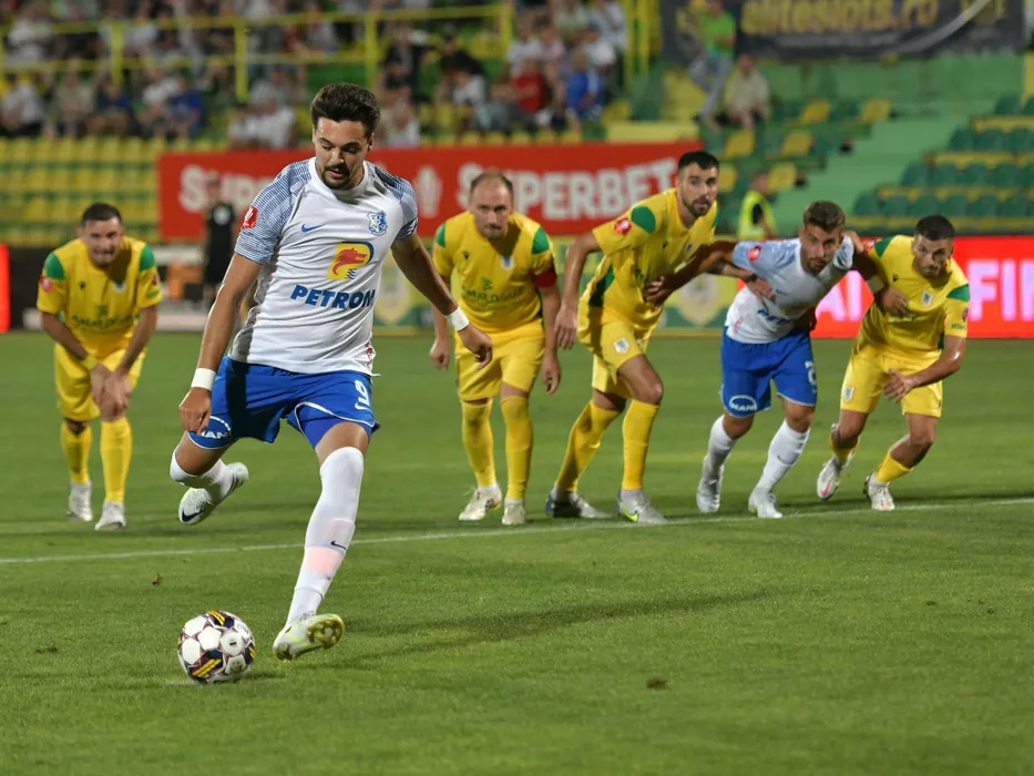 Adrian Petre Tabarcea marcheaza un gol din penalty in meciul de fotbal dintre CS Mioveni si Farul Constanta, contand pentru Superliga Superbet, desfasurat pe Stadionul Orasenesc din Mioveni, vineri 22 iulie 2022. © FOTO:Razvan Pasarica/SPORT PICTURES