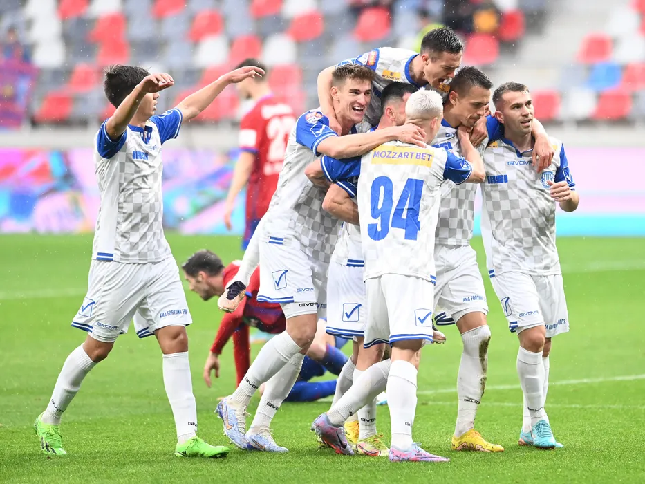Bucurie a fotbalistilor ieseni dupa un gol marcat cu Catalin Itu si Jakub Vojtus in meciul de fotbal dintre CSA Steaua Bucuresti si Politehnica Iasi, contand pentru Play-off-ul Ligii a-2-a Casa Pariurilor, desfasurat pe Stadionul Steaua-Ghencea din Bucuresti, marti 11 aprilie 2023. © FOTO:Razvan Pasarica/SPORT PICTURES