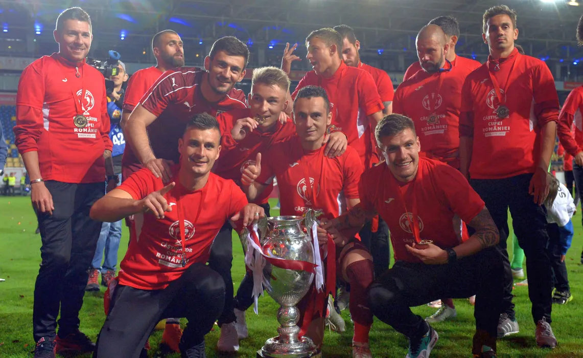 Hrvoje Spahija,Adrian Balan,Mircea Leasa si Petre Ivanovici pozeaza alaturi de trofeul Cupa Romaniei dupa castigarea finalei dintre FC Voluntari si Astra Giurgiu, desfasurata pe stadionul stadionul Ilie Oana din Ploiesti, sambata 27 mai 2017.Razvan Pasarica/SPORT PICTURES