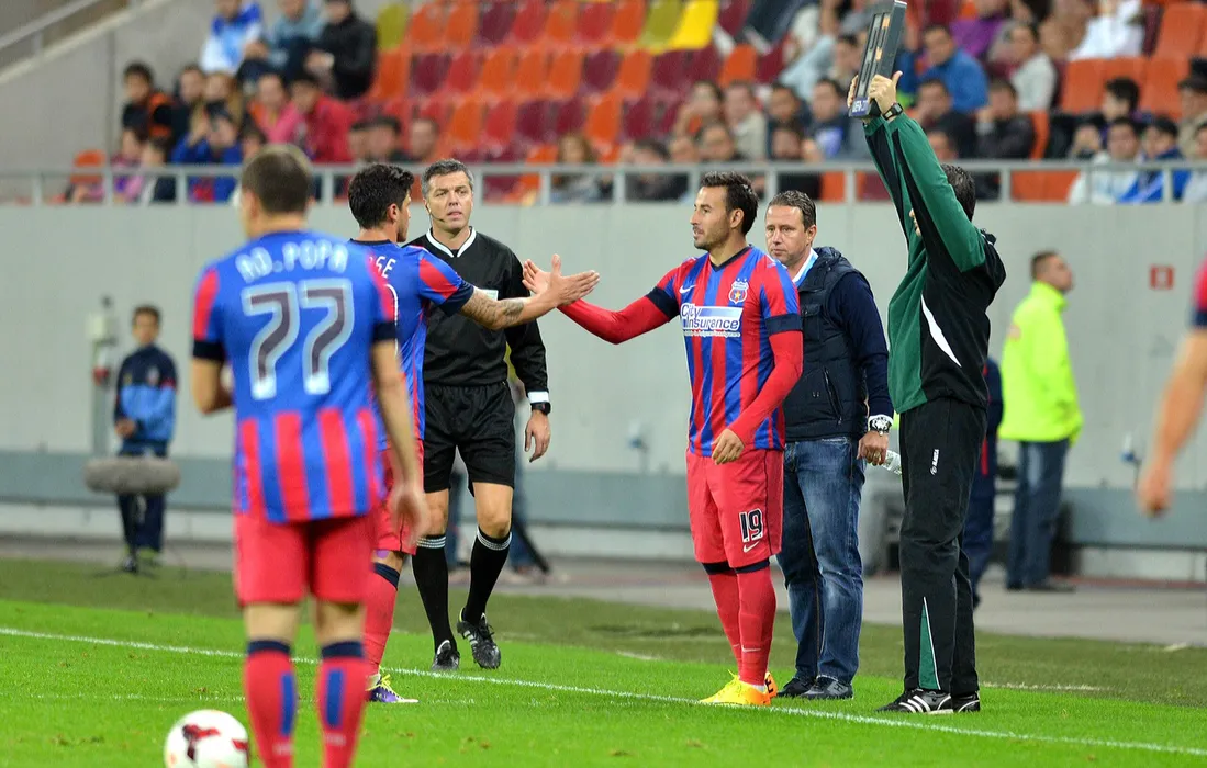 Adrian Cristea il inlocuieste pe Cristian Tanase sub privirile antrenorului stelist Laurentiu Reghecampf si arbitrului asistent Cristian Nica din Ploiesti.