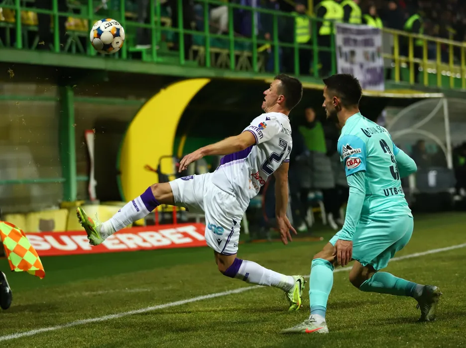 Vadim Rata si Din Alomerovic in meciul de fotbal dintre FC Arges si UTA Arad, contand pentru Superliga Superbet, desfasurat pe Stadionul Orasenesc din Mioveni, sambata 31 ianuarie 2026. © FOTO:SPORT PICTURES