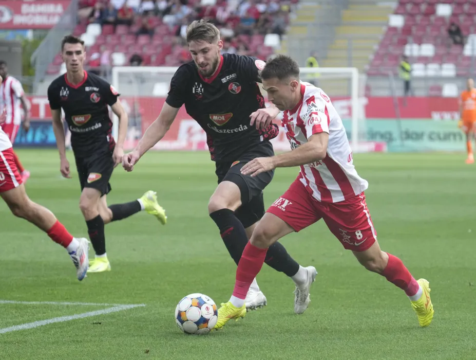 Alin Roman si Bence Végh in meciul de fotbal dintre UTA Arad si FK Csikszereda Miercurea Ciuc, contand pentru Superliga Superbet, desfasurat pe Arena Francisc Neuman din Arad, sambata 27 septembrie 2025. © FOTO:Alexandra Fechete/SPORT PICTURES