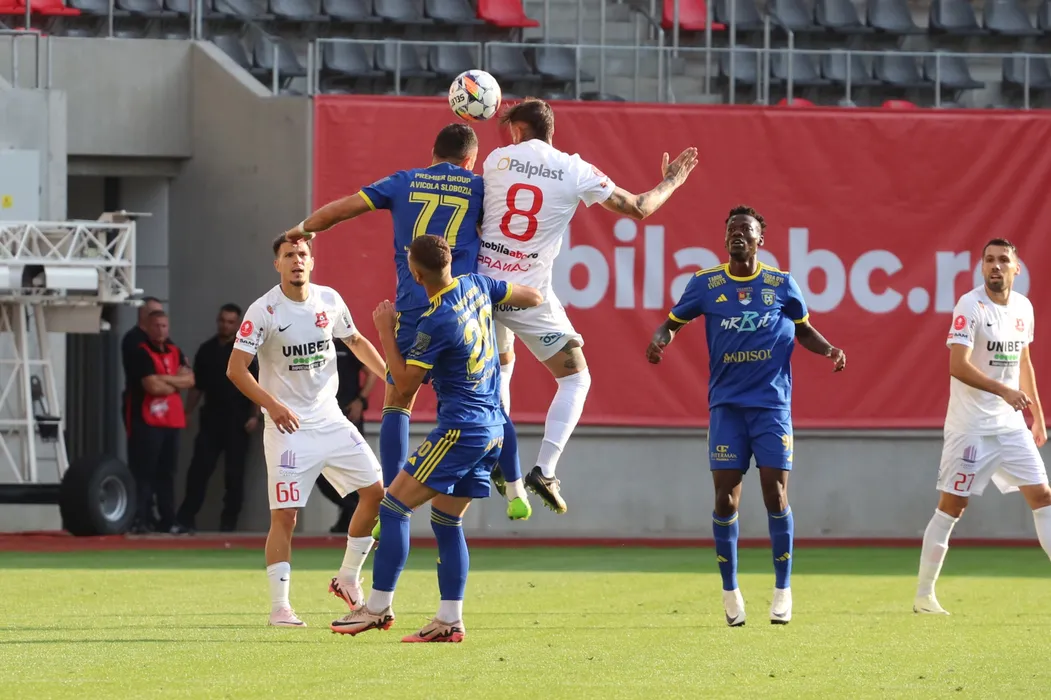 Tiberiu Ionuț Căpușă și Nkama Christ Afalna în meciul de fotbal dintre AFC Hermannstadt Sibiu si AFC Unirea 04 Slobozia, contând pentru Superliga Superbet, desfășurat pe Stadionul Municipal din Sibiu, vineri 26 iulie 2024. © FOTO: Valentin MACREA/SPORT PICTURES
