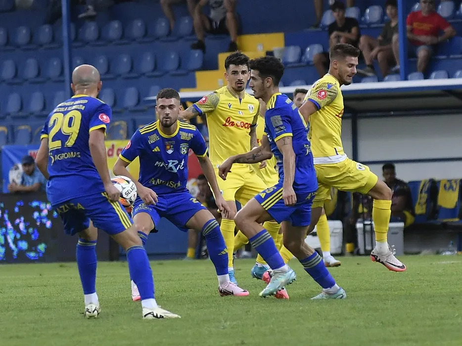 Ovidiu Ioan Perianu, Ariel Ignacio Lopez Varela și Mihnea Gabriel Radulescu, Sergiu Cătălin Hanca în meciul de fotbal dintre AFC Unirea 04 Slobozia și Petrolul Ploiești, contând pentru Superliga Superbet, desfășurat pe Stadionul din Clinceni, vineri 16 august 2024. © FOTO: Simion MECHNO/SPORT PICTURES
