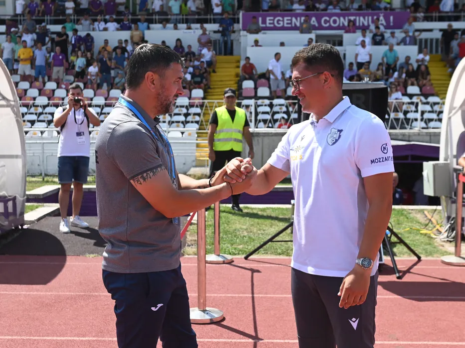 Cei doi antrenori Andrei Prepelita si Adrian Mihalcea se saluta inaintea meciului de fotbal dintre FC Arges si Chindia Targoviste, contand pentru Superliga Superbet, desfasurat pe Stadionul Nicolae Dobrin din Pitesti, duminica 28 august 2022. © FOTO:Razvan Pasarica/SPORT PICTURES