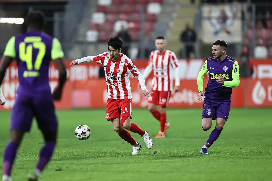 Sota Mino si Andrei Cordea in meciul de fotbal dintre UTA Arad si FC CFR 1907 Cluj, contand pentru Superliga Superbet, desfasurat pe Arena Francisc Neuman din Arad, miercuri 4 februarie 2026. © FOTO:Sebastian Tataru/SPORT PICTURES