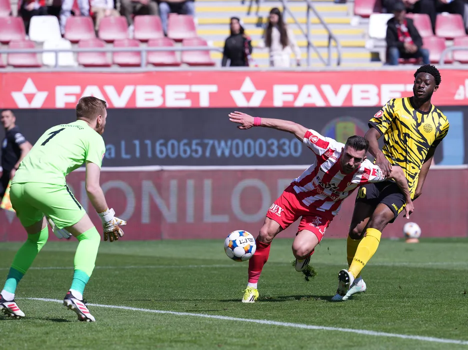 Marius Catalin Coman si Aboubacar Camara, George Petrisor Gavrilas in meciul de fotbal dintre UTA Arad si FC Metaloglobus Bucuresti contand pentru Superliga Superbet Play-Out, desfasurat pe Arena Francisc Neuman din Arad, duminica 5 aprilie 2026. © FOTO:Alexandra Fechete/SPORT PICTURES