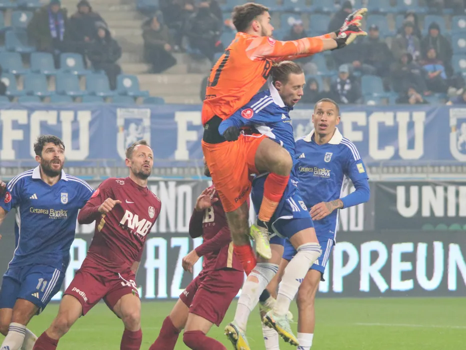 Răzvan Sergiu Sava și William Guido R Baeten, Aurelian Ionuț Chițu în meciul de fotbal dintre FCU 1948 Craiova și FC CFR 1907 Cluj, contând pentru Superliga Superbet, desfășurat pe Stadionul Ion Oblemenco din Craiova, sâmbătă 17 februarie 2024. © FOTO: Cătălin CIUPUREANU/SPORT PICTURES