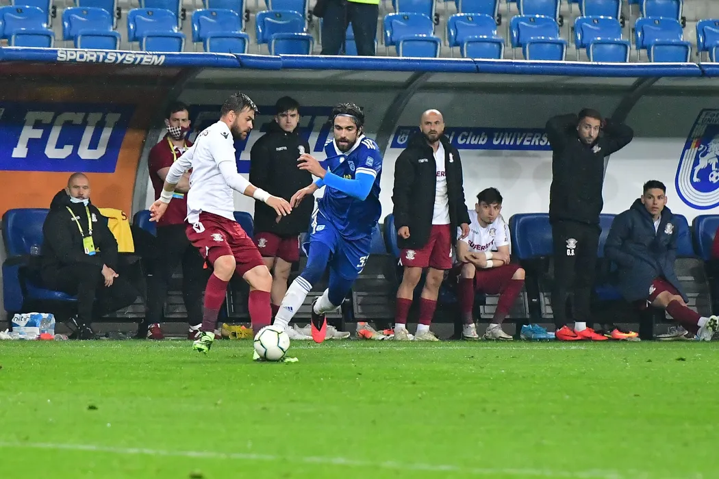 Meciul de fotbal dintre U Craiova 1948 (echipament albastru) si Rapid Bucuresti (echipament visiniu) din etapa 4 a play-out-ului din Liga 2, disputat pe stadionul Ion Oblemenco, luni, 19 aprilie 2021. REMUS BADEA / MEDIAFAX FOTO