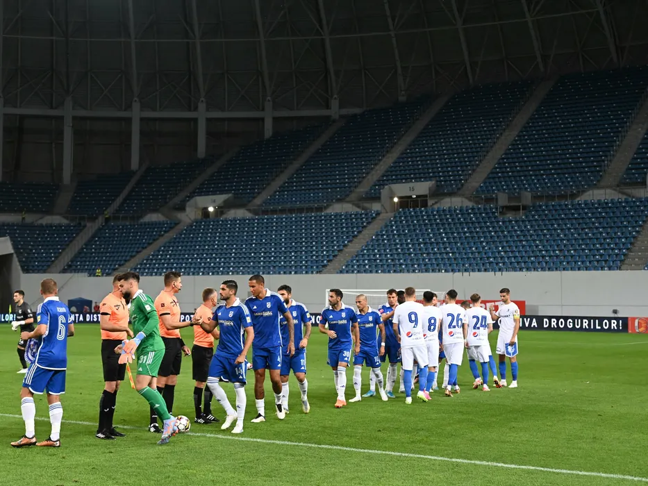 Fotbalistii craioveni alaturi de peluza fara suporteri la startul meciului de fotbal dintre FC U Craiova si Farul Constanta, contand pentru Superliga Superbet, desfasurat pe Stadionul Ion Oblemenco din Craiova, duminica 3 septembrie 2023. © FOTO:Razvan Pasarica/SPORT PICTURES