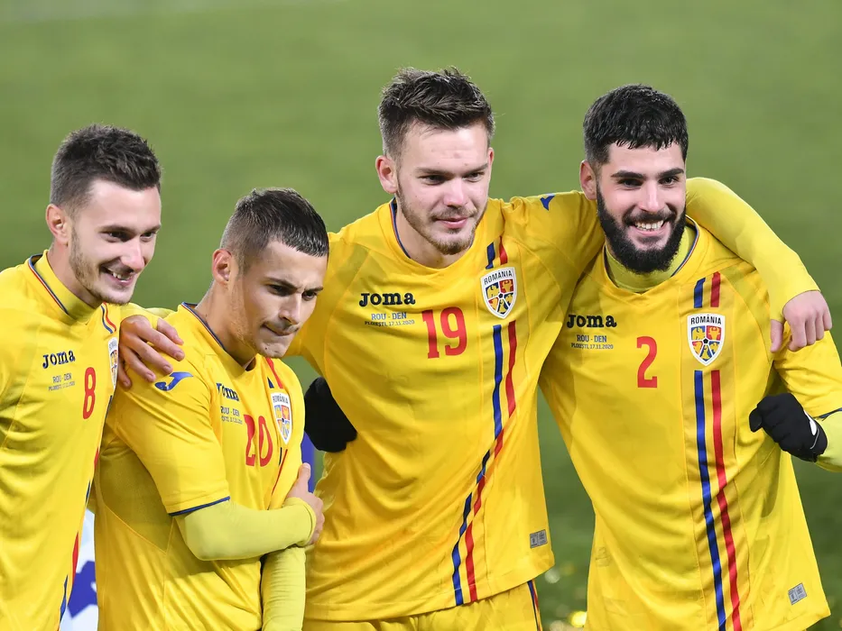 Fotbalistii romani Carlo Casap, Alexandru Matan, Denis Harut si Radu Boboc se bucura dupa calificarea la Campionatul European din 2021, in urma meciului de fotbal dintre Romania U21 si Danemarca U21, desfasurat fara spectatori pe Stadionul Ilie Oana din Ploiesti, marti 17 noiembrie 2020. © FOTO:Razvan Pasarica/SPORT PICTURES