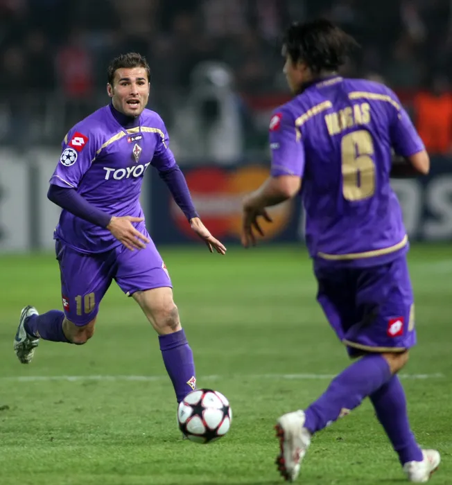 Adrian Mutu (C), de la AC Fiorentina preia un balon in meciul cu Debrecen, din etapa a treia a grupei E a Ligii Campionilor, in Ungaria, marti, 20 octombrie 2009. Atacantul Adrian Mutu a marcat doua goluri in meciul pe care Fiorentina l-a castigat cu scorul de 4-3, in deplasare, in fata formatiei ungare Debrecen. ALEXANDRU HRENIUC / MEDIAFAX FOTO