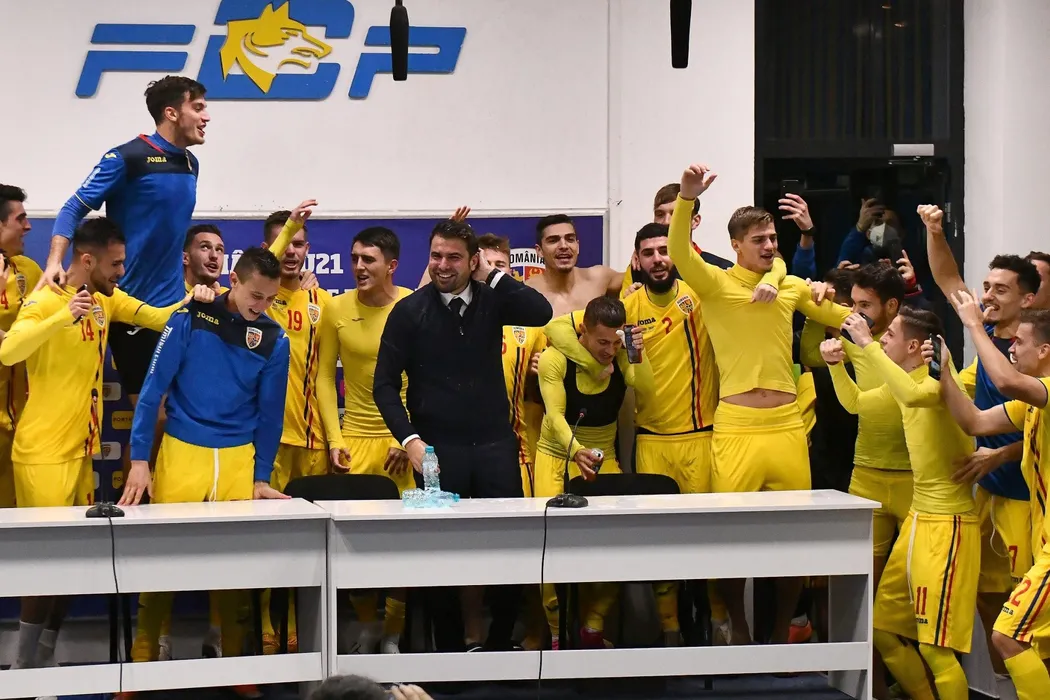 Fotbalistii romani se bucura alaturi de antrenorul lor, Adrian Mutu, dupa calificarea la Campionatul European din 2021 la conferinta de presa in urma meciului de fotbal dintre Romania U21 si Danemarca U21, desfasurat fara spectatori pe Stadionul Ilie Oana din Ploiesti, marti 17 noiembrie 2020. © FOTO:Razvan Pasarica/SPORT PICTURES