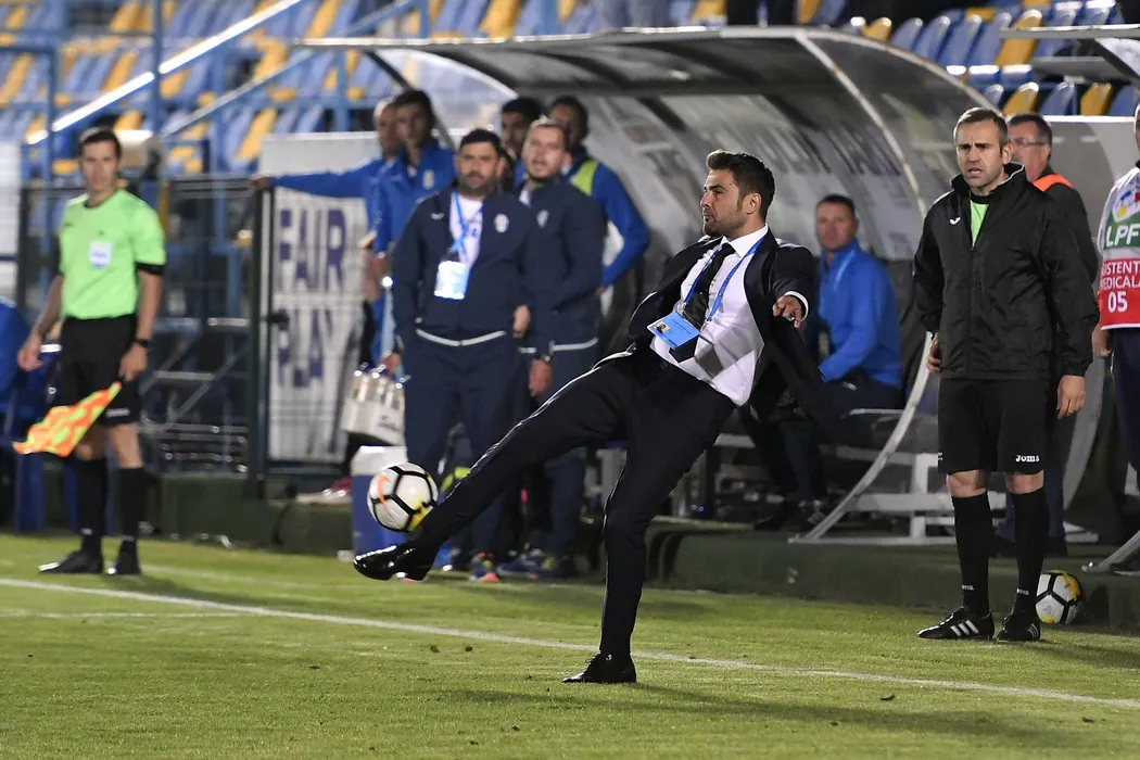 Adrian Mutu suteaza intr-o minge la meciul de fotbal dintre FC Voluntari si Juventus Bucuresti, din cadrul playout-ului Ligii 1 Betano, desfasurat pe Stadionul Anghel Iordanescu din Voluntari, vineri 27 aprilie 2018. © FOTO Razvan Pasarica/SPORT PICTURES