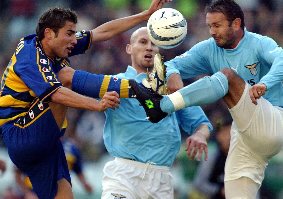 Parma forward Romanian Adrian Mutu (L) fights for the ball with Lazio defenders Yougoslav Sinisa Mihajlovic (R) and Dutch Jaap Stam (C) during their Italian first league match 10 Novembrer 2002 at Rome's Olympic Stadium. AFP PHOTO GABRIEL BOUYS,Image: 69517464, License: Rights-managed, Restrictions: , Model Release: no