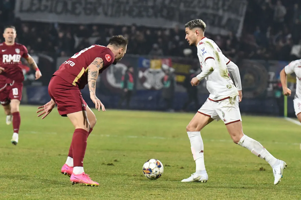 Albion Rrahmani și Vasile Mogoș în meciul de fotbal dintre FC CFR 1907 Cluj si FC Rapid 1923, contând pentru Superliga Superbet, desfășurat pe Stadionul Dr.Constantin Rădulescu din Cluj-Napoca, sâmbătă 10 februarie 2024. © FOTO: Flaviu BUBOI/SPORT PICTURES