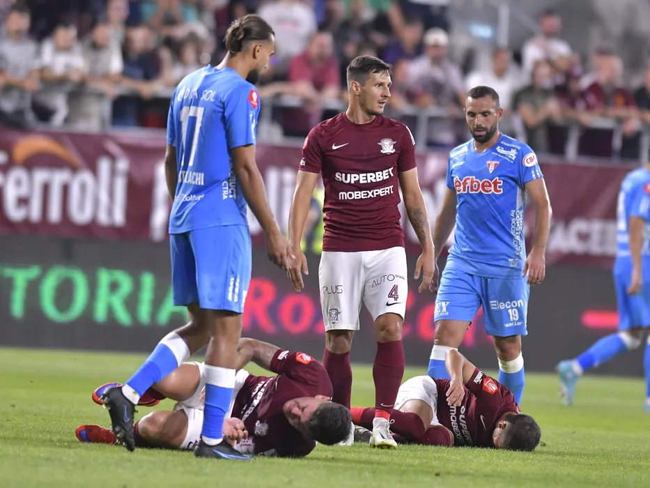 Fotbalistii rapidisti la pamant alaturi de Ljuban Crepulja si Idriz Batha in meciul de fotbal dintre Rapid Bucuresti si UTA Arad, contand pentru Superliga Superbet, desfasurat pe Stadionul Rapid Giulesti din Bucuresti, sambata 20 august 2022. © FOTO:Razvan Pasarica/SPORT PICTURES