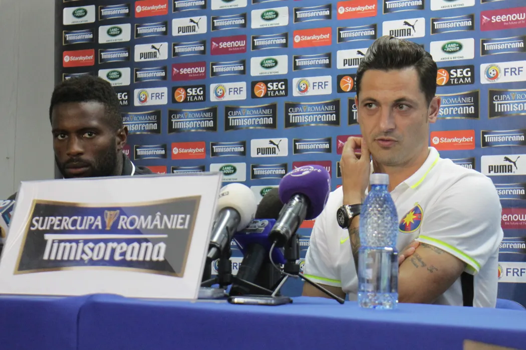 Jucatorul Fernando Varela si antrenorul echipei FC Steaua Bucuresti, Mirel Radoi, participa la o conferinta de presa, marti, 7 iulie 2015. Supercupa României, dintre formatiile Steaua Bucuresti si ASA Tirgu Mures se va disputa miercuri, pe stadionul Farul din Constanta, de la ora 21.00. ALEXANDRU RAITA / MEDIAFAX FOTO