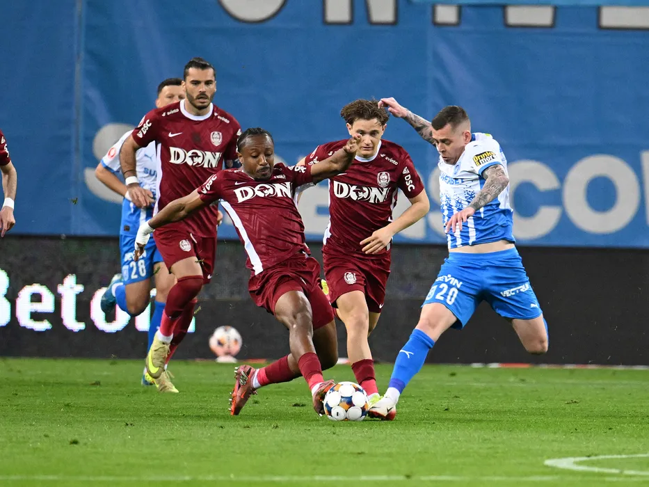 Karlo Muhar, Tidiane Keita, Lorenzo Biliboc si Alexandru Cicaldau in meciul de fotbal dintre Universitatea Craiova si CFR Cluj, contand pentru Play off-ul Superligii Superbet, desfasurat pe Stadionul Ion Oblemenco din Craiova, luni 6 aprilie 2026. © FOTO:Razvan Pasarica/SPORT PICTURES