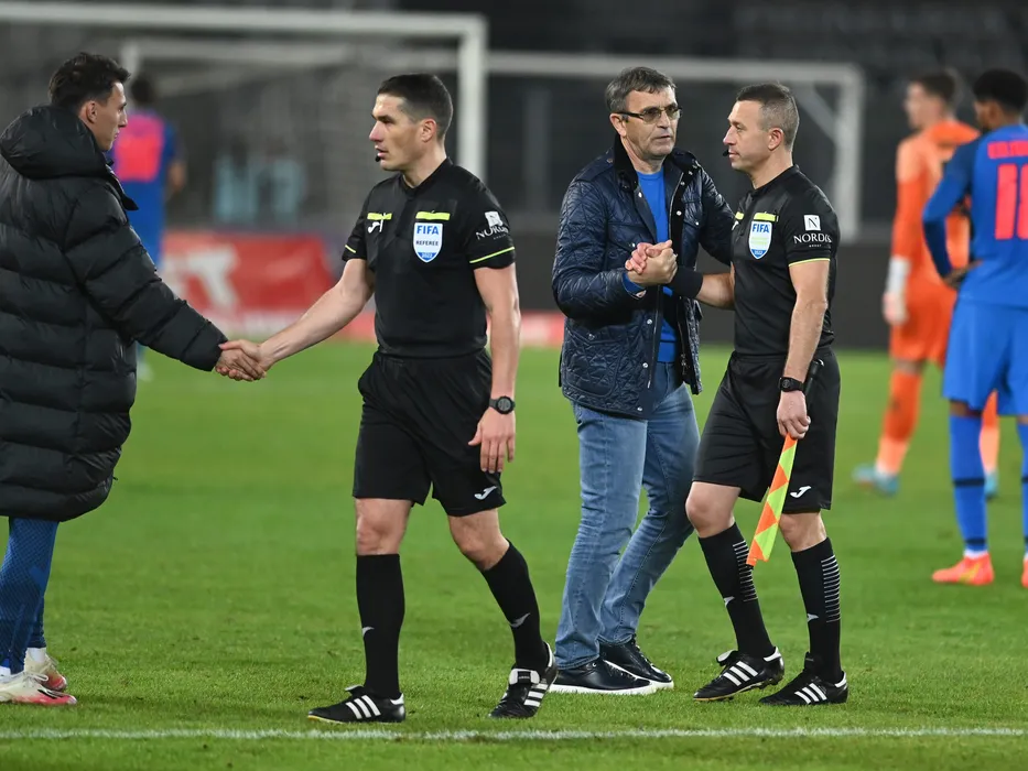 Risto Radunovic, arbitrul central Istvan Kovacs, Eugen Neagoe si arbitrul asistent Ovidiu Artene se saluta dupa meciul de fotbal dintre Universitatea Cluj si FCSB, contand pentru Superliga Superbet, desfasurat pe Cluj Arena din Cluj Napoca, duminica 31 octombrie 2022. © FOTO:Razvan Pasarica/SPORT PICTURES