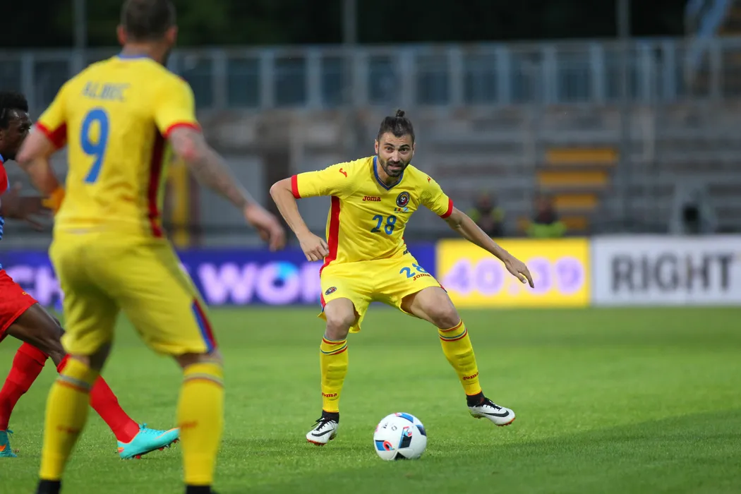 Adrian Ropotan (S), de la nationala Romaniei, suteaza in timpul meciului amical de fotbal contra eselectionatei RD Congo, disputat pe stadionul Giuseppe Sinigaglia, din Como, Italia, miercuri 25 mai 2016. SEBASTIAN TATARU / MEDIAFAX FOTO