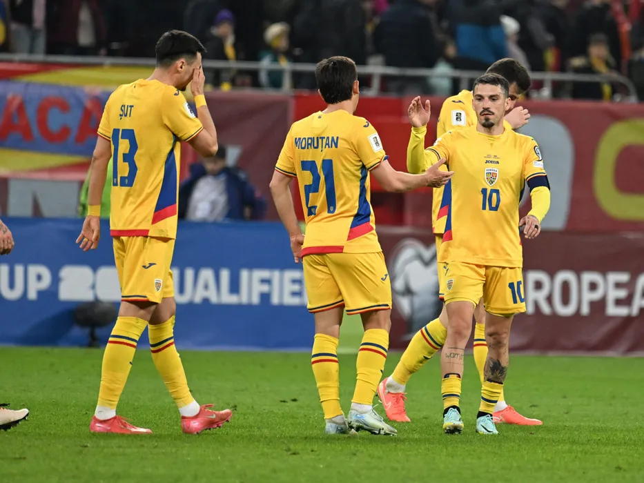 Fotbalistii romani Adrian Sut si Olimpiu Morutan sunt incurajati de Nicolae Stanciu dupa meciul de fotbal dintre Romania si Bosnia Hertegovina, din cadrul Preliminariilor Campionatului Mondial 2026, desfasurat pe Arena Nationala din Bucuresti, vineri 21 martie 2025. © FOTO:Razvan Pasarica/SPORT PICTURES