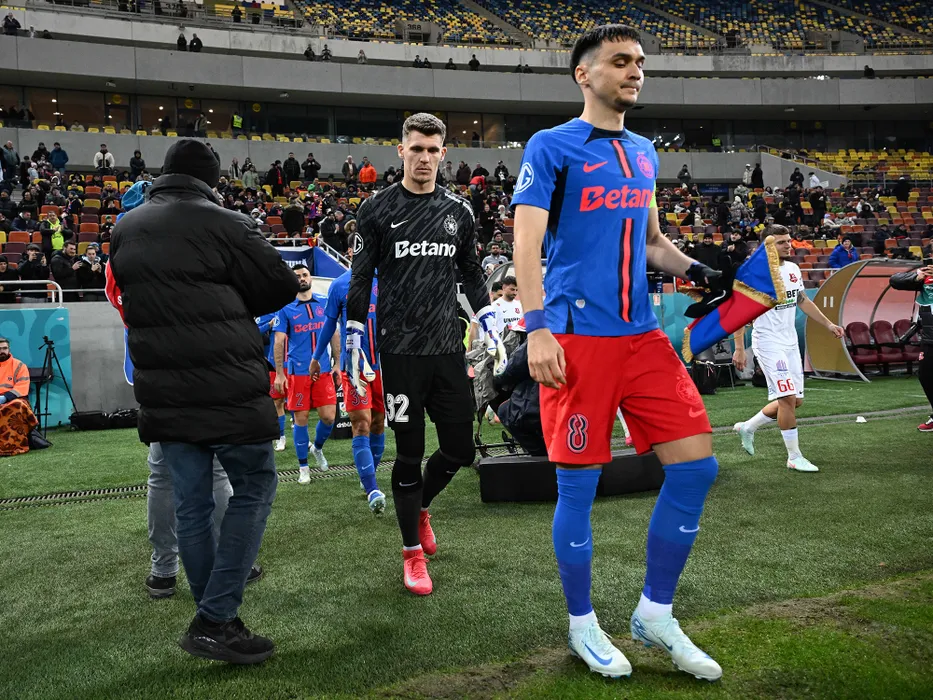 Fotbaliștii ros-albastrii Ștefan Târnovanu, Valentin Cretu si Adrian Gheorghe Șut la startul meciului de fotbal dintre FCSB si FC Hermannstadt, din cadrul Superligii Superbet, desfasurat pe Arena Nationala din Bucuresti, vineri 17 ianuarie 2025. © FOTO:Razvan Pasarica/SPORT PICTURES