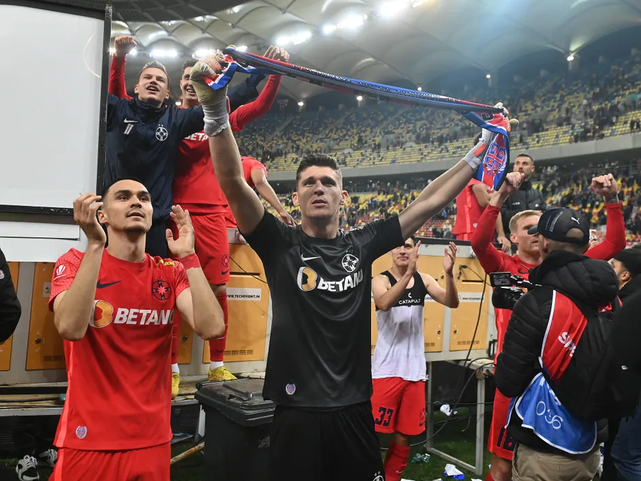 Fotbalistii stelisti Grigoras Alexandru Pantea, Adrian Gheorghe Sut si Stefan Tarnovanu saluta galeria dupa meciul de fotbal dintre FCSB si Rapid Bucuresti, contand pentru Superliga Superbet, desfasurat pe Arena Nationala din Bucuresti, duminica 6 noiembrie 2022. © FOTO:Razvan Pasarica/SPORT PICTURES