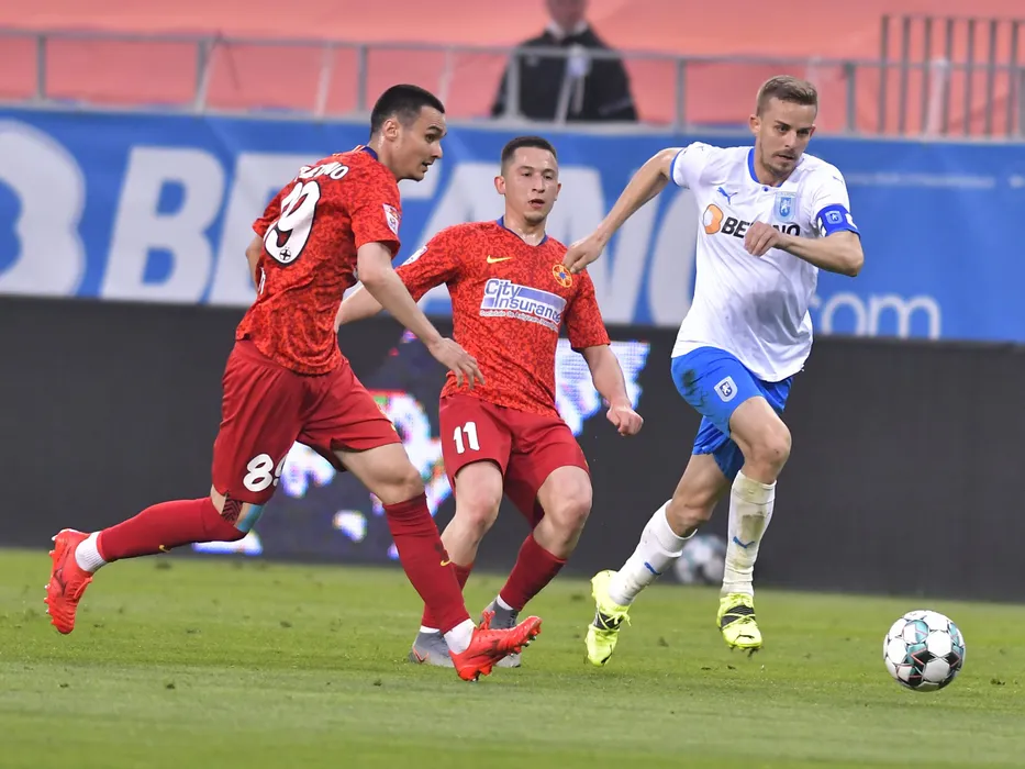 Adrian Gheorghe Sut, Olimpiu Vasile Morutan si Nicusor Silviu Bancu in meciul de fotbal dintre Universitatea Craiova si FCSB, contand pentru Play-off-ul Ligii 1 Casa Pariurilor, desfasurat fara spectatori pe Stadionul Ion Oblemenco din Craiova, joi 29 aprilie 2021. © FOTO:Razvan Pasarica/SPORT PICTURES