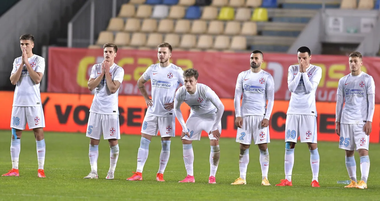 Fotbalistii stelisti Dragos Ionut Nedelcu, Risto Radunovic, Gabriel Bogdan Simion, Denis Gratian Harut, Andrei Gabriel Istrate, Valentin Cretu, Adrian Gheorghe Sut si Ovidiu Ioan Perianu la penalty-uri in meciul de fotbal dintre CFR Cluj si FCSB, Supercupa Romaniei, desfasurat fara spectatori pe Stadionul Ilie Oana din Ploiesti, joi 15 aprilie 2021. © FOTO:Razvan Pasarica/SPORT PICTURES