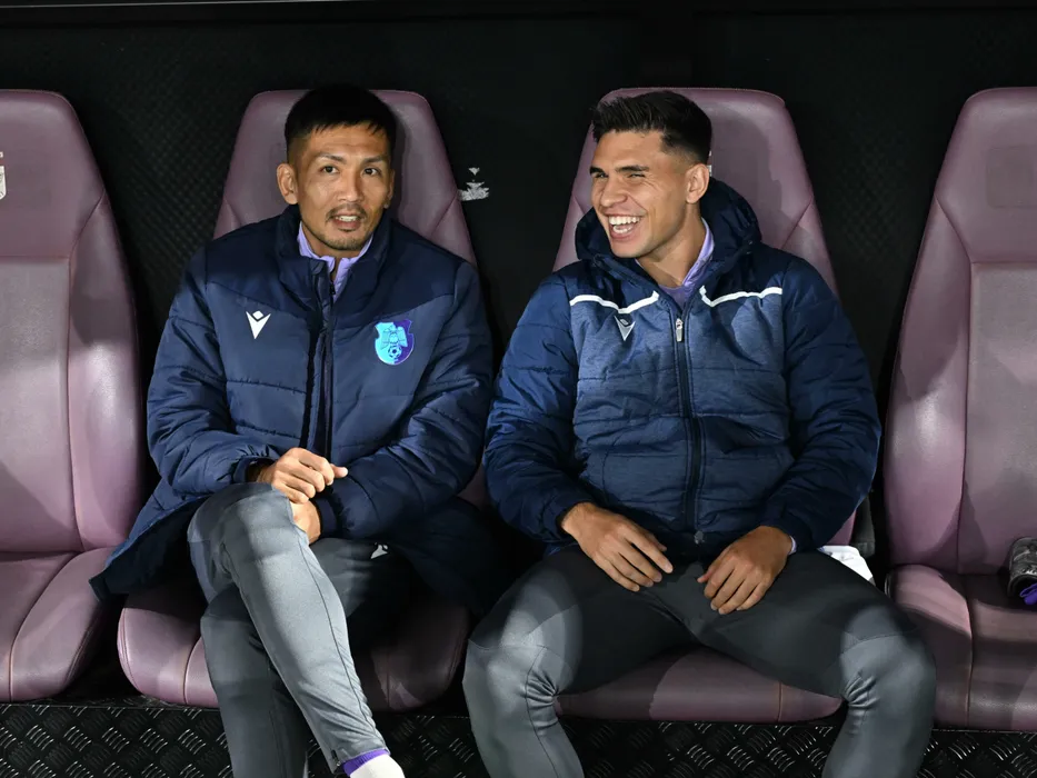 Takayuki Seto si Ricardo Manuel Pinho Matos pe banca argesaeana la meciul de fotbal dintre Rapid Bucuresti si FC Arges, din cadrul Superligii Superbet, desfasurat pe Superbet Arena-Giulesti din Bucuresti, sambata 8 noiembrie 2025. © FOTO:Razvan Pasarica/SPORT PICTURES
