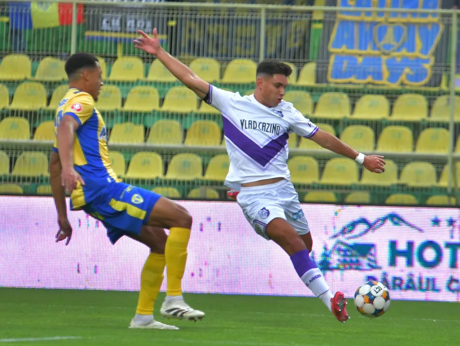 Ricardo Manuel Pinho Matos si Cedric Benjamin Roche Yohan in meciul de fotbal dintre FC Arges si FC Petrolul Ploiesti, contand pentru Superliga Superbet, desfasurat pe Stadionul Orasenesc din Mioveni,sambata 4 octombrie 2025. © FOTO:Mihai Nitoiu/SPORT PICTURES