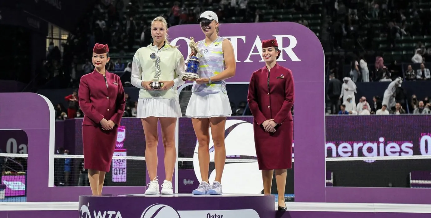 (R to L) 2022 WTA Qatar Open championship winner Iga Swiatek of Poland and runner-up Anett Kontaveit of Estonia pose with their trophies alongside Qatar Airways stewardesses on the podium after the final match of the 2022 WTA Qatar Open in Doha on February 26, 2022.,Image: 665107213, License: Rights-managed, Restrictions: , Model Release: no, Credit line: Profimedia