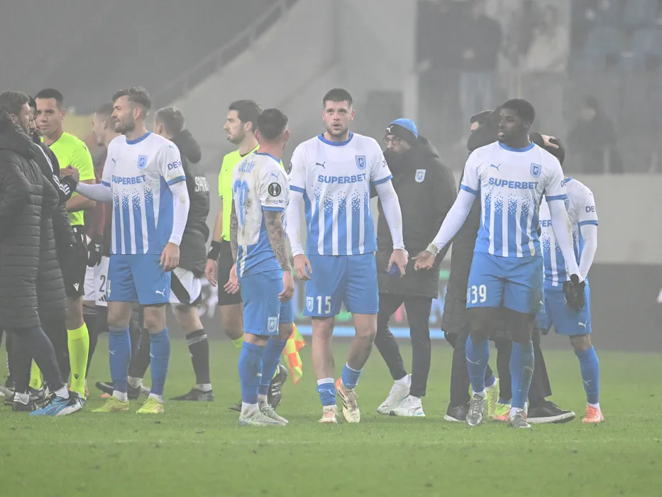 Fotbalistii craioveni Alexandru Cretu, Juraj Badelj si Aime Steven Nsasa Nsimba Labe suparati dupa meciul dintre Universitatea Craiova si Sparta Praga, contand pentru UEFA Conference League, desfasurat pe Stadionul Ion Oblemenco din Craiova, joi 11 decembrie 2025. © FOTO:Razvan Pasarica/SPORT PICTURES