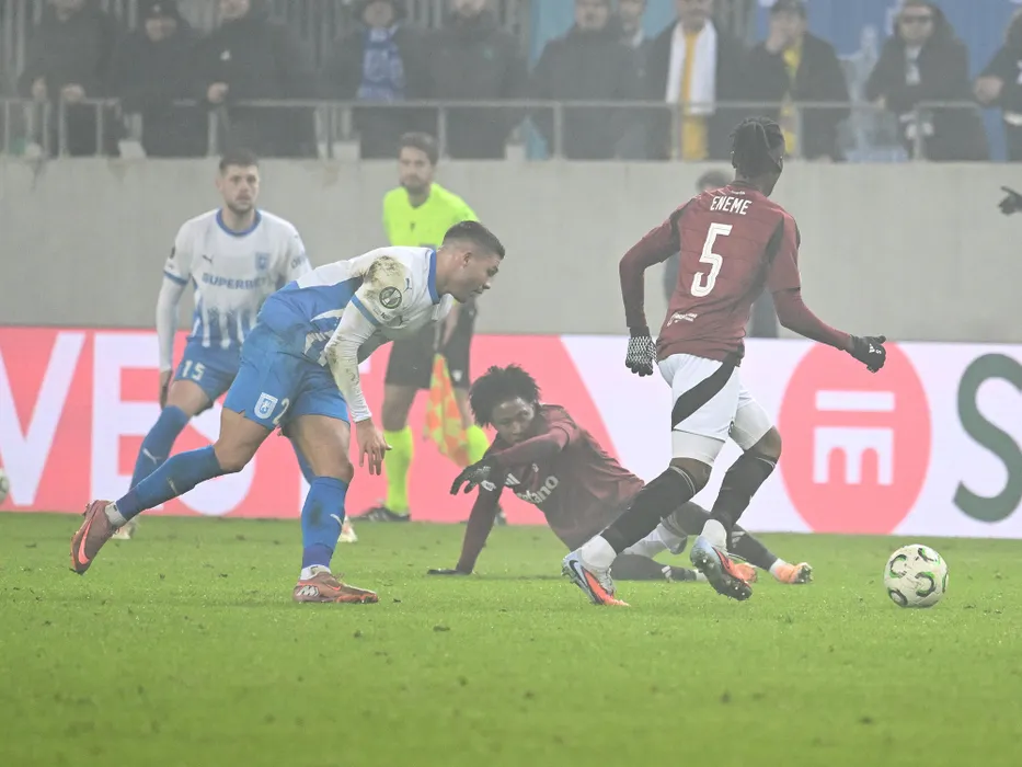 Samuel Teles Pereira Nunes Da Silva, Santiago Eneme si Angelo Preciado in meciul dintre Universitatea Craiova si Sparta Praga, contand pentru UEFA Conference League, desfasurat pe Stadionul Ion Oblemenco din Craiova, joi 11 decembrie 2025. © FOTO:Razvan Pasarica/SPORT PICTURES