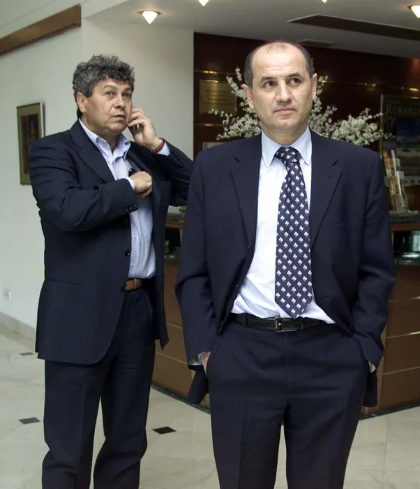 CD A23 / DIGI / Grupul McCann-Erickson in parteneriat cu Federatia Romana de Fotbal si ISM au organizat la hotelul "Crowne Plaza" o conferinta de presa in legatura cu retragerea din reprezentativa de fotbal a Romaniei a lui Gheorghe Hagi, festivitate care va avea loc pe data de 24 aprilie. In imagine, Mircea Lucescu si George Copos.