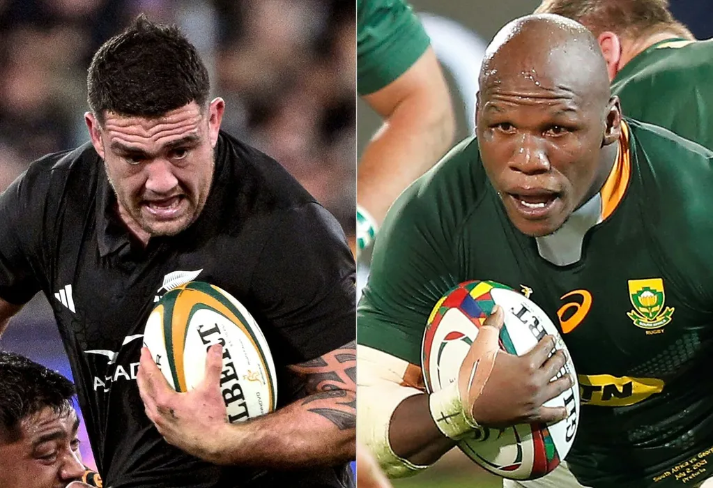 (COMBO) This combination of photographs created on October 26, 2023, shows New Zealand's Codie Taylor (L) as he breaks through the Australian defence in the Rugby Championship 2023 and Bledisloe Cup Test match between Australia and New Zealand at the MCG in Melbourne on July 29, 2023 and South Africa's hooker Bongi Mbonambi (R) as he runs with the ball during the first rugby union Test match between South Africa and Georgia at Loftus Versfeld stadium in Pretoria on July 2, 2021.