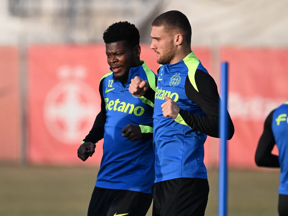Fotbalistii ros albastrii Enagnon David Kiki si George Daniel Bîrligea la antrenamentul FCSB de dinaintea meciului impotriva celor de la Manchester United, din cadrul UEFA Europa League, desfasurat la Baza Sportiva FCSB din Bucuresti, miercuri 29 ianuarie 2025. © FOTO:Razvan Pasarica/SPORT PICTURES
