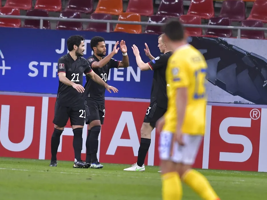 Bucurie a fotbalistilor germani dupa un gol marcat cu İlkay Gundogan si Serge Gnabry in meciul de fotbal dintre Romania si Germania, din cadrul Preliminariilor Campionatului Mondial 2022, desfasurat fara spectatori pe Arena Nationala din Bucuresti, duminica 28 martie 2021. © FOTO:Razvan Pasarica/SPORT PICTURES